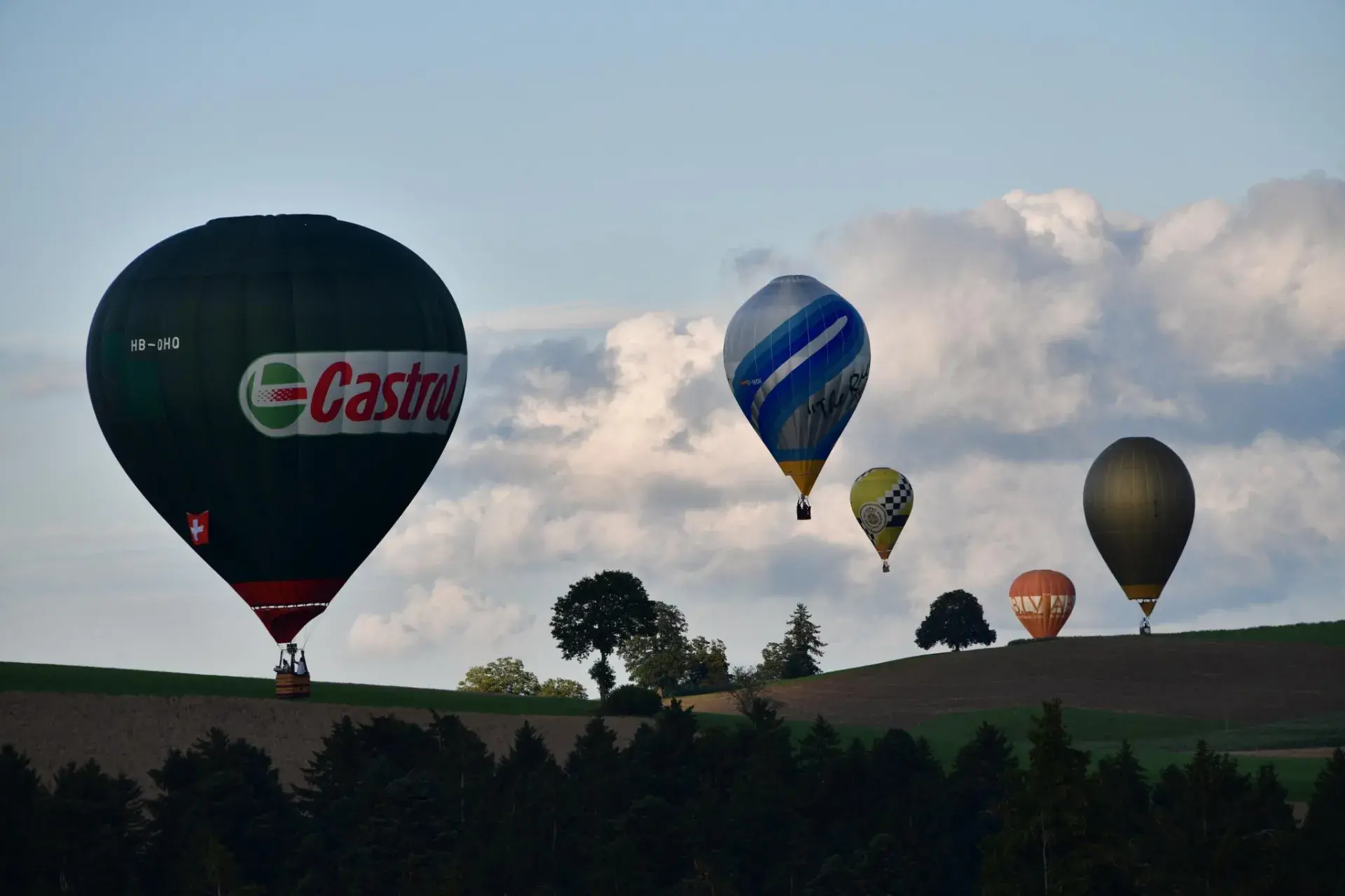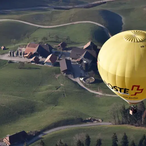 Schweben über Hügel, Täler, Felder und Ortschaften